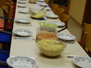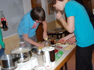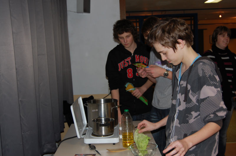 Vier Gruppen mit je 4 Teens machten sich auf den Weg zum Einkaufen. Aus den mitgebrachten Zutaten kochten sie ein Menü. Drei Gruppen hatten sich für Spaghetti und 1 Gruppe für Pizza entschieden, das war doch sehr abwechslungsreich.