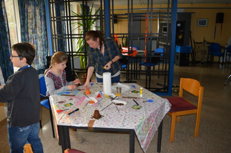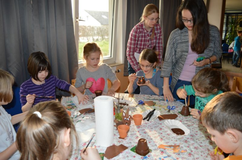 Basteln war angesagt in der Jungscharstunde vor Ostern. Jedes Kind bastelte sich seinen eigenen Kresse-Hasen. Erst wurde das Tontöpfchen schön angemalt und dann der Kopf, Hände und Füße ausgeschnitten. Nach dem diese angeklebt waren, ging es ans säen der Kresse. Es entstanden viele sehr individuelle Hasen. Rechtzeitig zu Ostern konnte die Kresse geerntet werden.